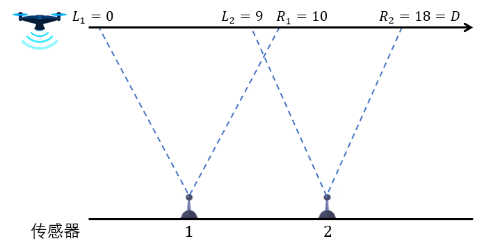 背景:在一条笔直的河流边部署了许多地面传感器,来监测河流及岸边环境。无人机需要沿着笔直的河岸飞行,并采集这些传感器的数据。 现在,需要你帮助确定无人机在这过程中的飞行速度(可以随时改变),使得在确保所有传感器的数据都能被完全采集的同时,最小化无人机的飞行能耗。 无人机在固定的高度飞行,且总飞行距离固定,为 D 米。将这条直线飞行路径用数轴表示,无人机从起点 x=0 飞向终点 x=D。沿途共部署了 n (<=1000) 个传感器,从 1 到 n 分别编号,它们需要将自身的数据上传至无人机。 传感器的传输距离并非无限远,无人机只有在某个传感器的传输范围以内才可以采集它的数据。 第 i 个传感器的传输范围是从 x=L_i 到 x=R_i 的区间,也可记为 (L_i, R_i),其中 L_i<R_i 。另外,传感器之间的位置关系满足 0 <= L_1 < L_2 < ... < L_n < D 且 0 < R_1 < R_2 < ... < R_n = D。 采集数据需花费一定的时间,采集 传感器i 的数据需要花费 t_i 秒。无人机按照传感器编号顺序采集数据,即先采集 传感器1 的数据,再采集 传感器2 的数据……最后采集 传感器n 的数据。当完成 传感器i 的数据采集后,无人机才能开始对 传感器i+1 的数据采集。 如下图所示,多个传感器的传输范围可能存在重叠,但并不会相互包含。另外,无人机在飞行时会消耗能量。当无人机以速度 v 飞行时,消耗的功率为 P(v) 。 例如,当无人机以 v=1 的速度从 x=9 飞至 x=18,消耗的能量为 P(1)*(18-9)/1。 注意: 我们既不允许无人机悬停,也不允许无人机反向飞行。例如,在上图中,在飞出 传感器1 的传输范围(飞过 x=R_1)之前,必须完成对 S1 的数据采集。